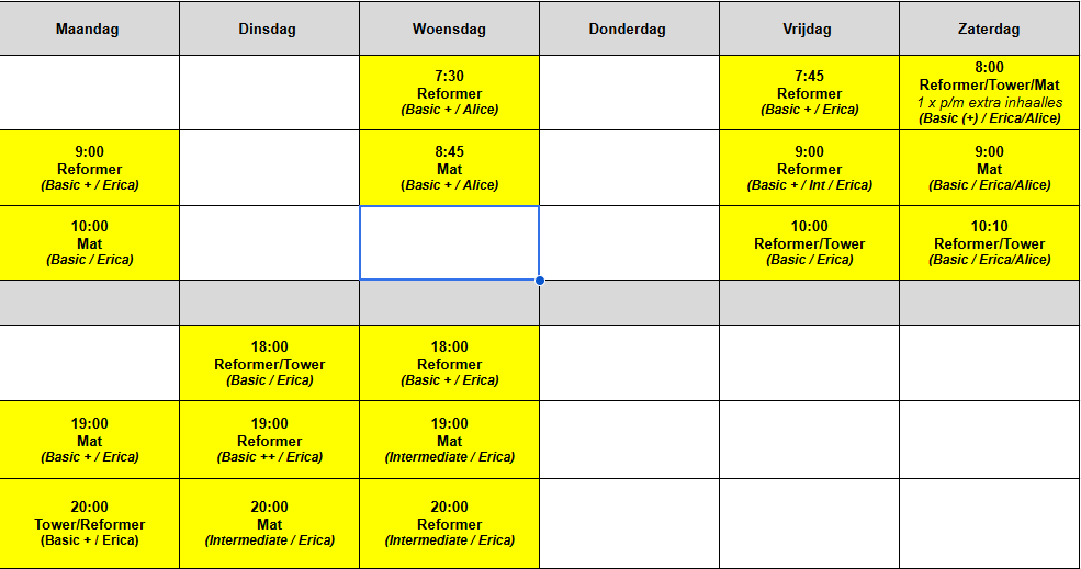 Hieronder tref je het wekelijkst lesrooster (het schema kan afwijken in de vakantieperiodes - lessen kunnen dan worden samengevoegd).